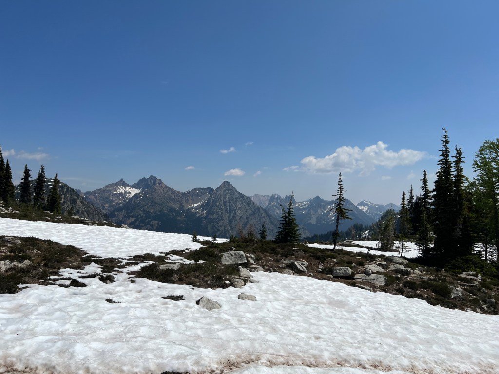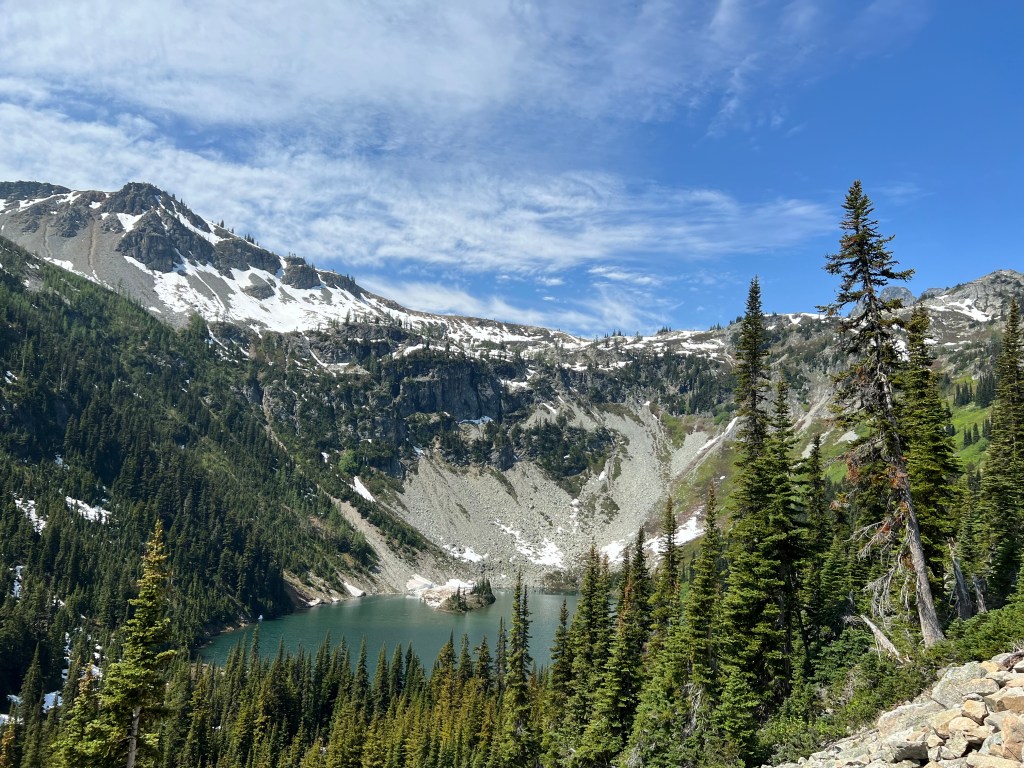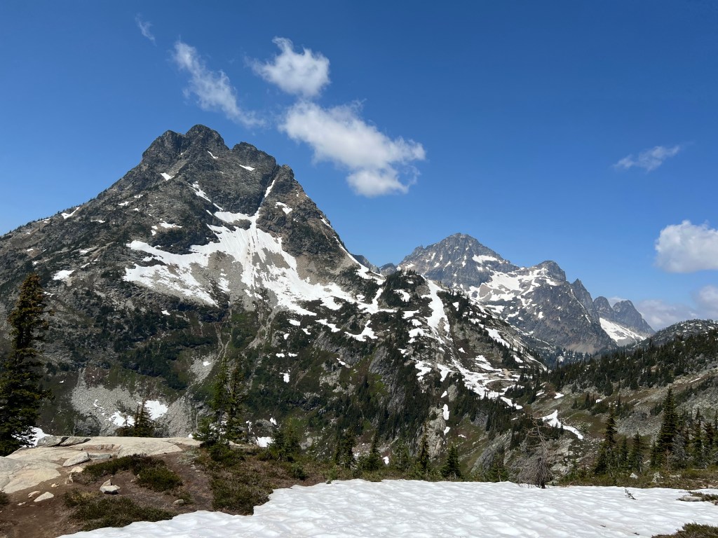 We camped down at one of the national park campgrounds at Diablo Lake, which was an excellent place to stay as a base camp for exploring. Early arrival then is no big deal, and we had the parking lot pretty much to ourselves. Also going in June is fun, way less crowded then July and August, and you will see snow on the trail, and depending on the year, may need snowshoes. Most folks did fine this last year with good hiking boots.