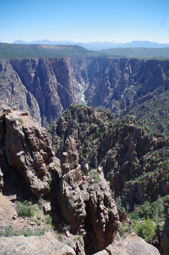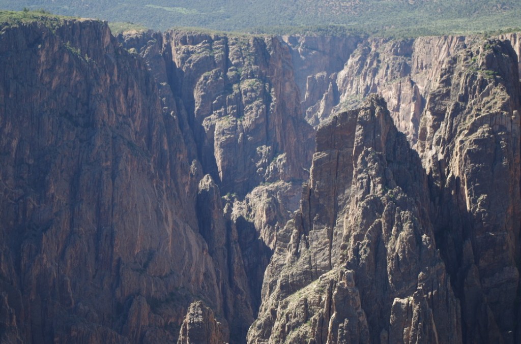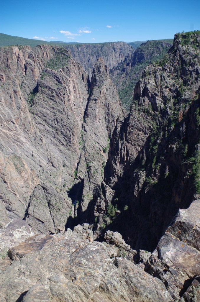 As opposed to the Grand Canyon, this valley is much steeper and narrower, giving rise to rock that seems to just jut up straight out of the river bottom. The drop is over 2000 feet, and the distance rim to rim is only 1000 feet! The area is uplifted volcanic rock, mostly granite, pegmatite, gneiss, and schist, (The Gunnison Uplift) that was carved over 2 million years by fast moving snow melt from the surrounding mountains that had nowhere else to go.