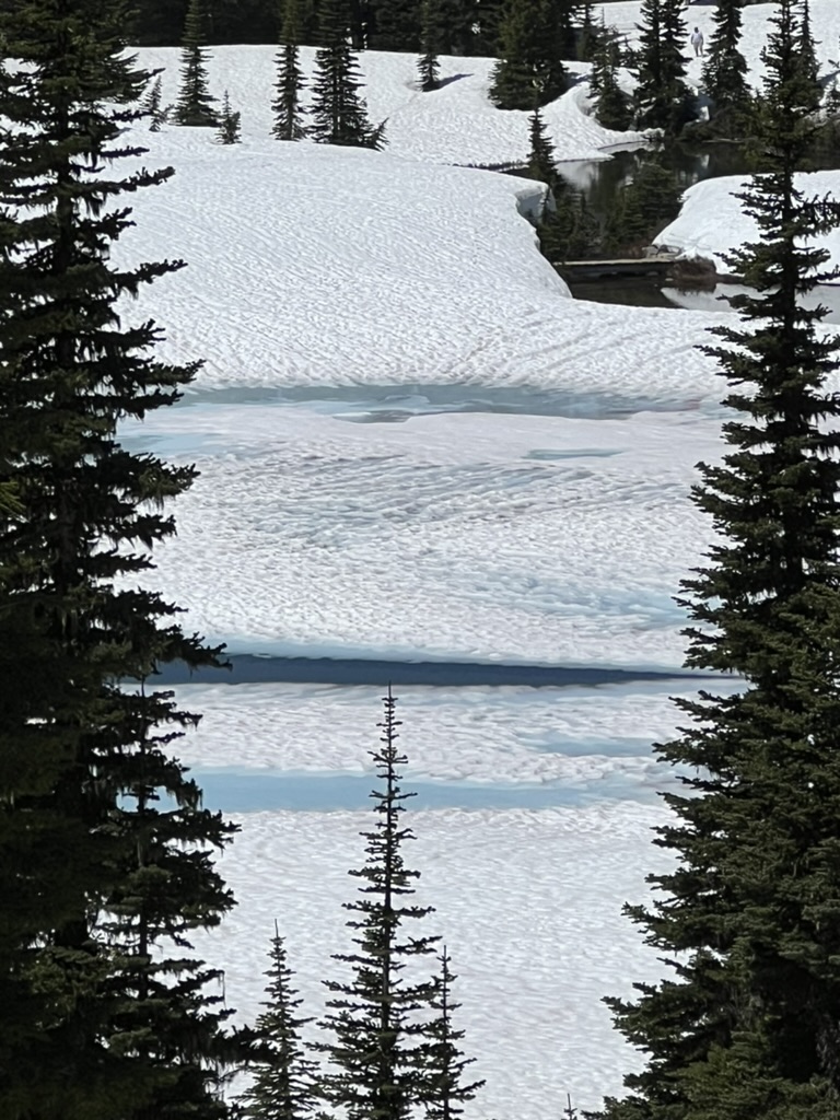 This picture was taken just off to the West of the summit today, so the snow pack is about 4-6 feet, melting rapidly which from my experience, puts as at an average year. The official record shows us mildly under average. So, this means we are on track for a normal summer hiking season! In fact, on the way down from the pass, every hiking parking area on Hwy 410 looked pretty full. The PNW hikers are antsy, and seeing the amazing run off from the snow melt. This produces so many waterfalls, which are awesome for amazing pictures, and so much mud, which can be dangerous for falls, so bring your hiking poles and strong, waterproof boots.