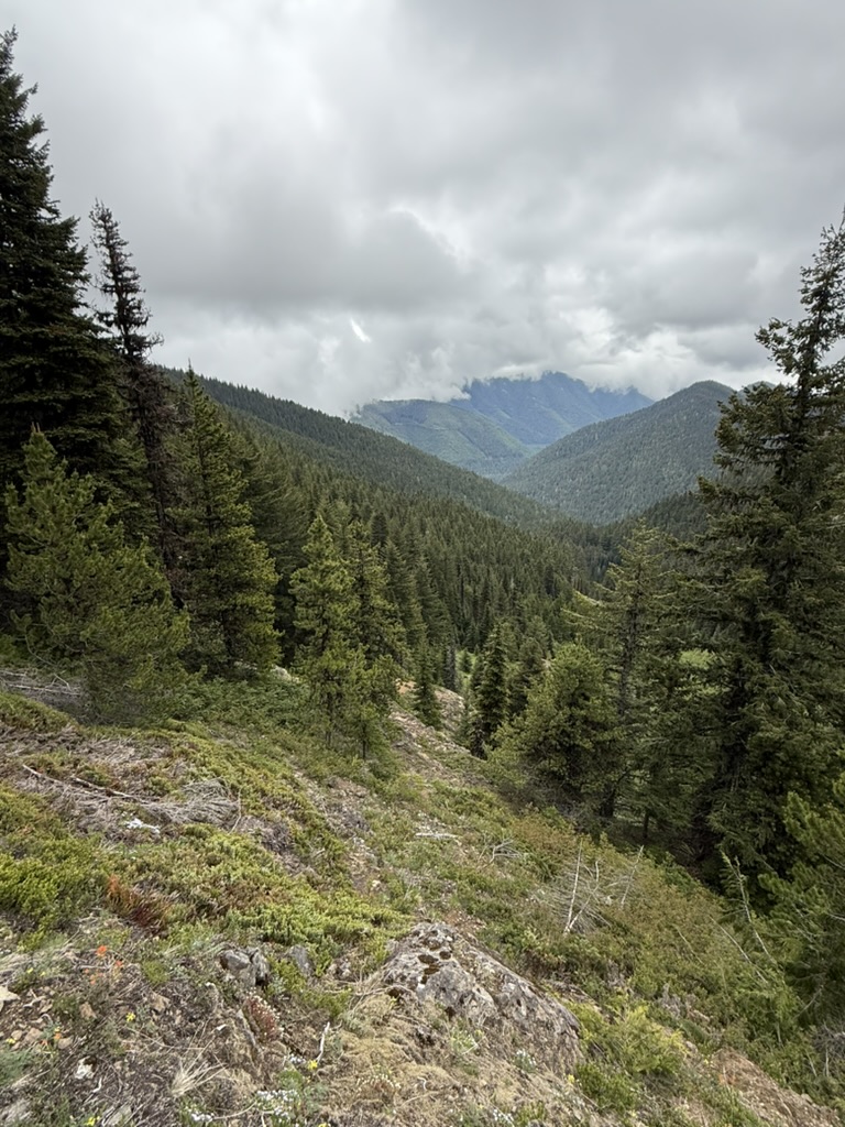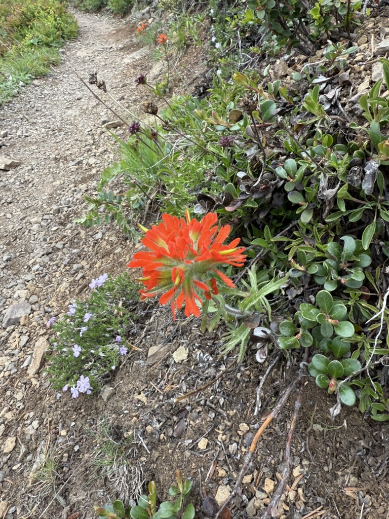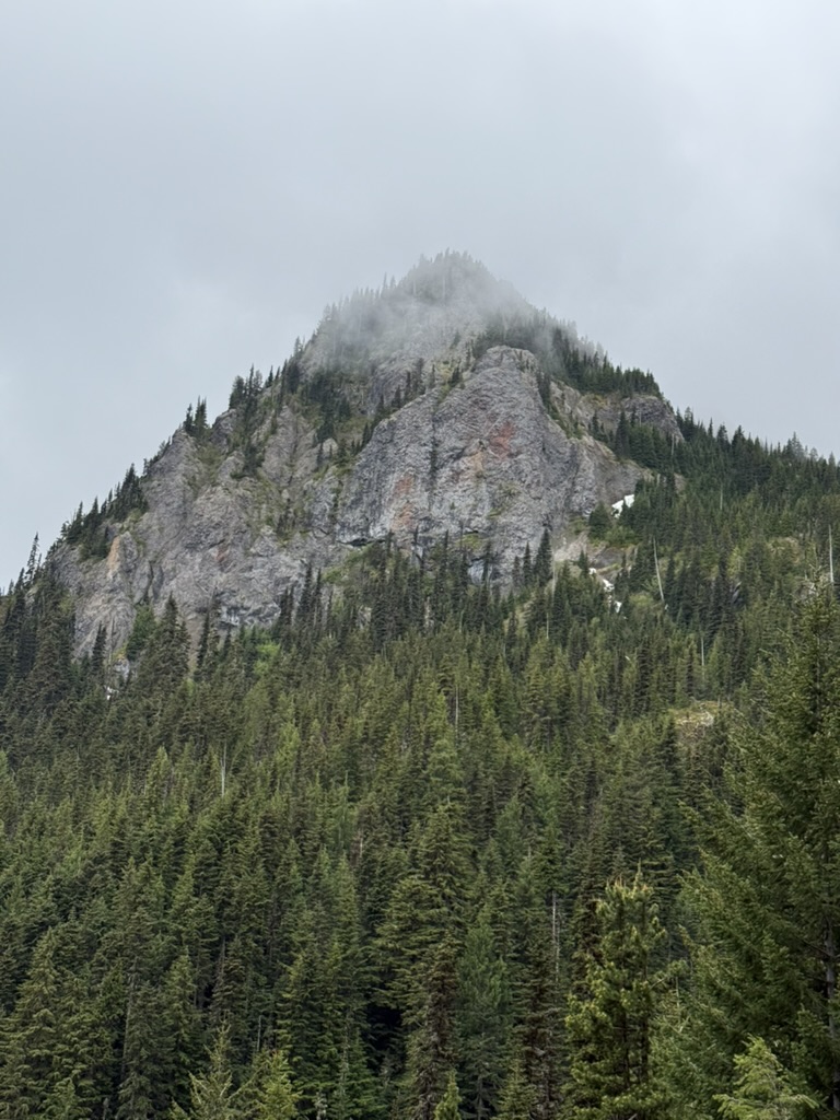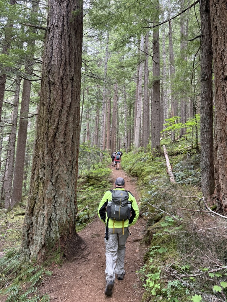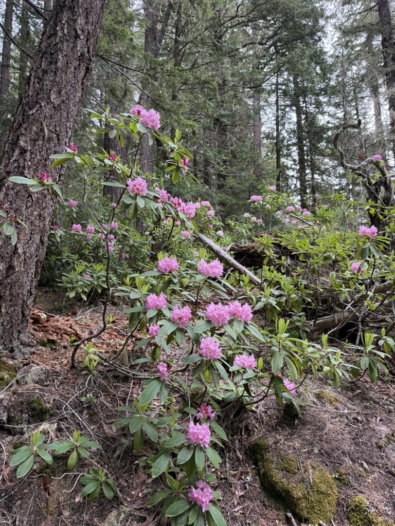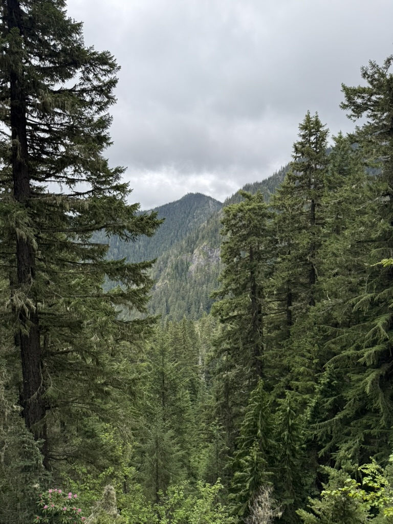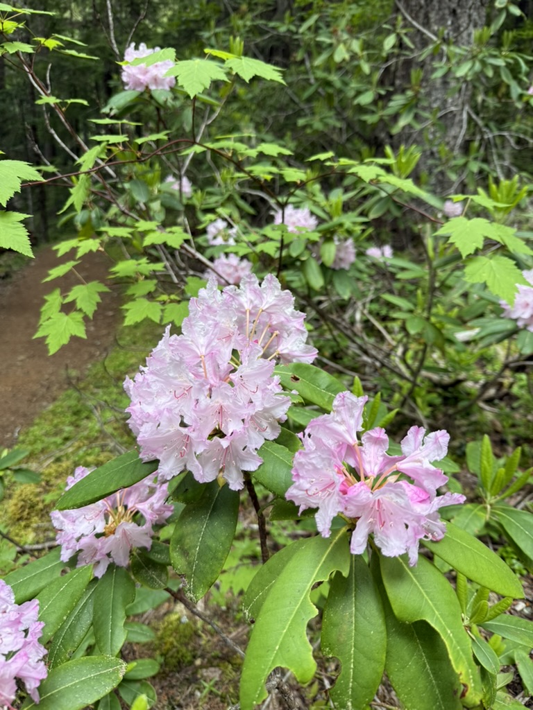 It was a moody Juneteenth in the Olympics, with a marine layer just hanging out over the mountains and hiding them from view. I organized a hike with folks from work and over ten people participated, many hiking up into the Eastern Olympics for the first time. I was excited for them but was worried that the weather would dampen spirits. I never want a first hike to be bad! The Olympics never disappoint though. Mt Townsend was our goal, and we all met at the trailhead at 9:00 am. Their was decent parking available at that time, and we gathered our gear, used the latrine, and started up the trail which quickly rises in elevation through a beautiful forest filled with rhododendrons, pink and wild.