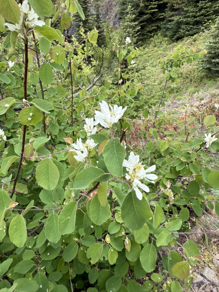 Up and up the trail goes through switchbacks trudging back and forth through the woods. I try to count but then always lose track. Through the trees, the valley narrows and the peaks show their steep rock cliffs. Various flowers line the trail with their amazing variety of colors and shapes.