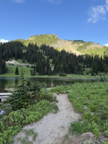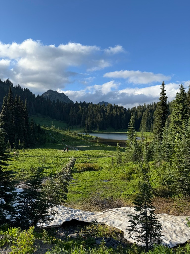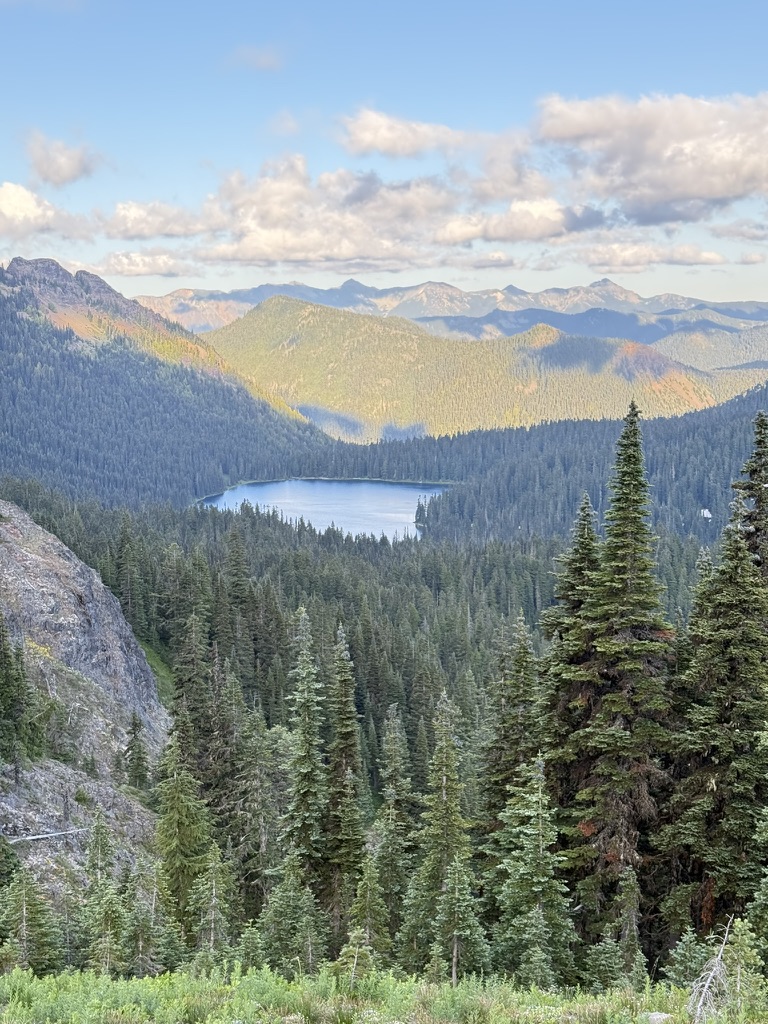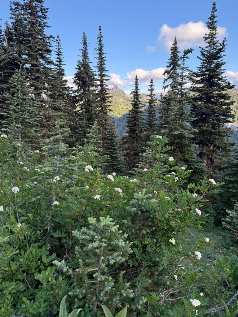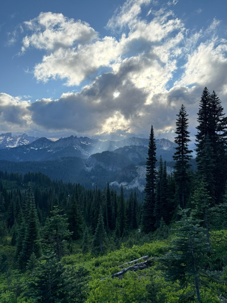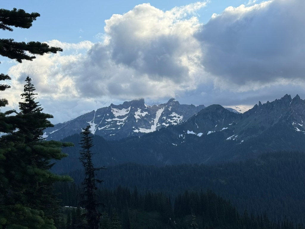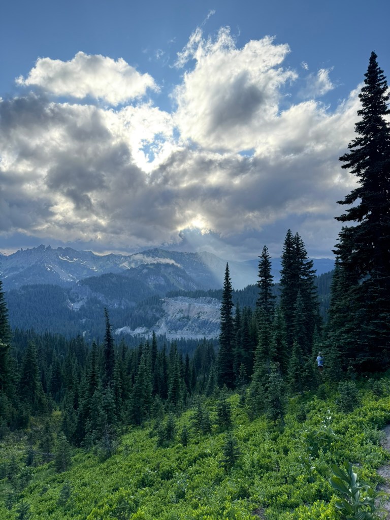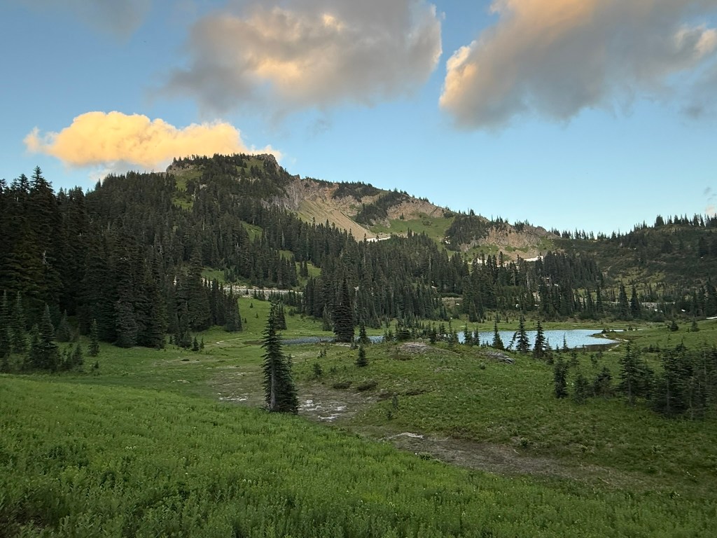 It’s July and my family spent a weekend up near Chinook Pass, and after everyone left and I finished my cleanup chores, I drove up to the pass for another dose of my favorite hike: Naches Peak Loop! It’s my go-to hike for July because of a number of factors. First the snow pack is so huge in the Cascades, this area usually just melts out enough to hike maybe by the 4th of July. So you wait a week and some change, and maybe the wildflowers are blooming… Then the life is just bursting forth from every direction. Birds are everywhere (along with some mosquitos), deer are chowing down on the fast growing plant life, and every tree is pushing growth as fast as possible in this short summer season. Colors are vibrant and intense. It’s just pure joy for the photographer. Finally, temperatures are just not extreme. An evening hike is comfortable: not too hot nor too cold. Weather can be variable, so some amazing cloud formations are just randomly forming often in multiple directions.