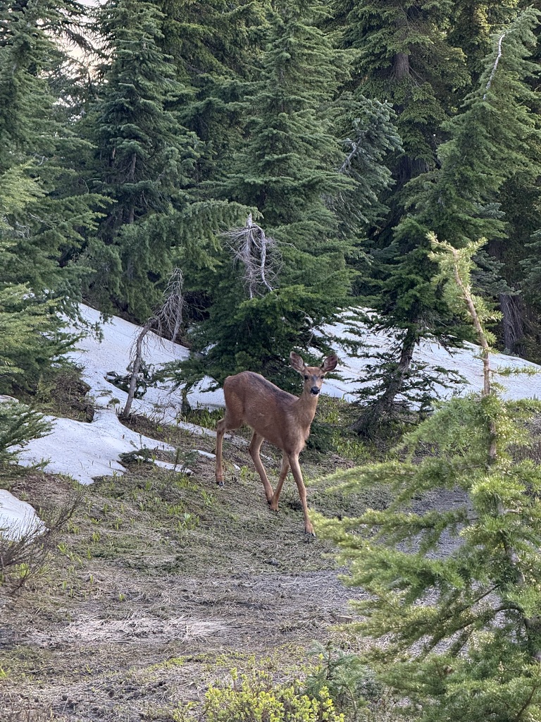 A friendly deer greeted me on the trail just over the highway as I made my way up the loop trail. It rises a few hundred feet and you have to keep checking over your shoulder to see if Mount Rainier is peaking through the clouds.