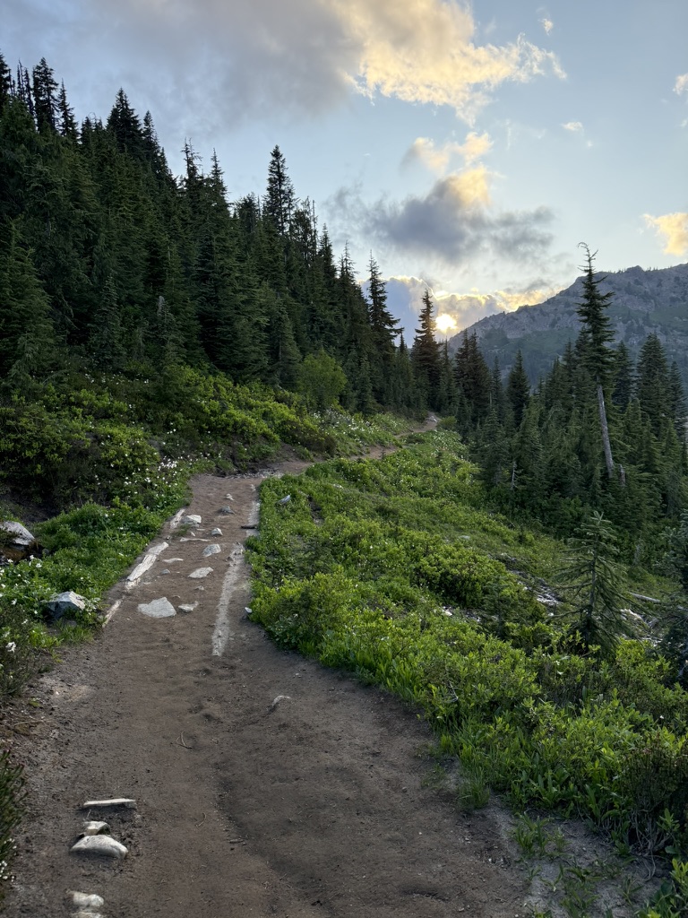 The sun is setting as I cross the highway over the log bridge and then march down to Tipsoo Lake again.