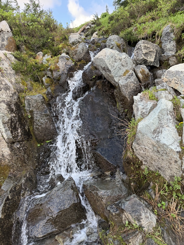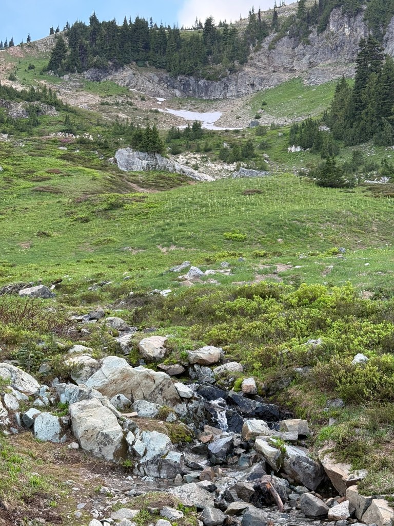 The snowmelt makes everything wet and streams run everywhere, rushing downhill forming full rivers that makes their way west and east from the apex of the Cascades.