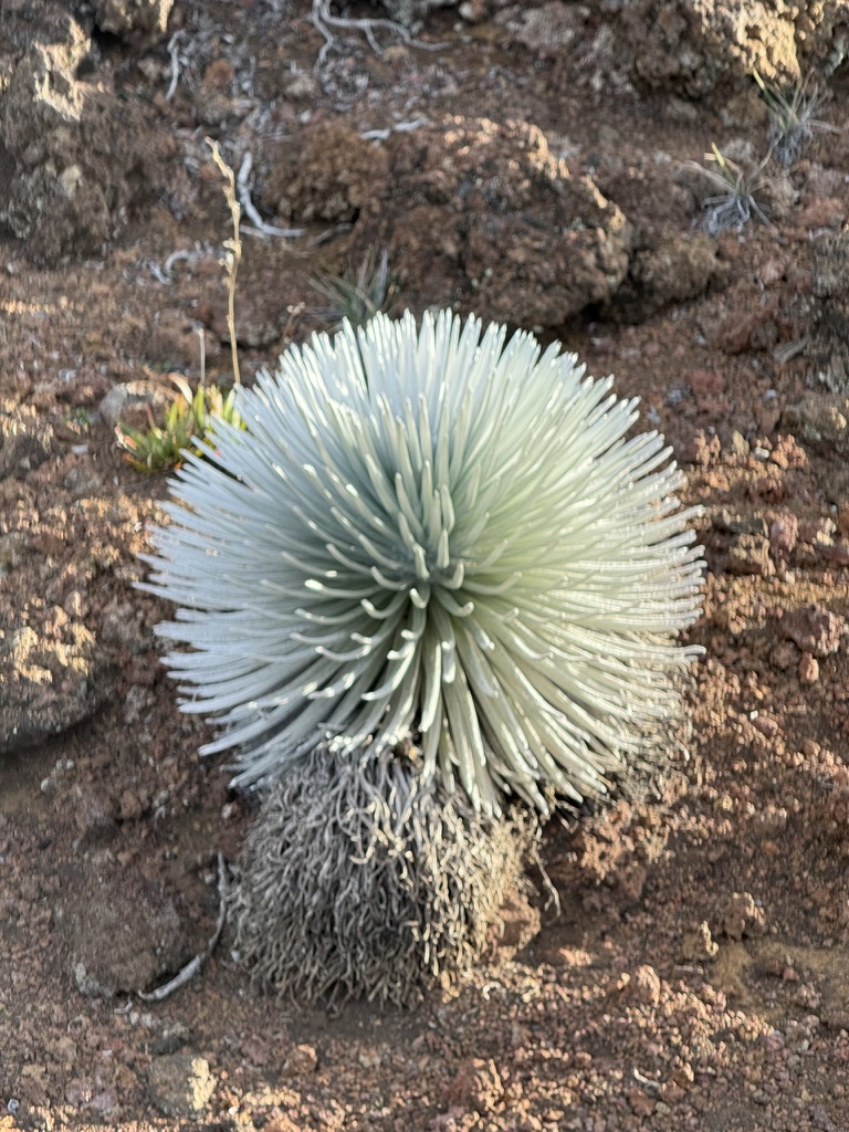“The silvery hairs, fleshy leaves, and low-growing rosette form of the Haleakalā silversword (Argyroxiphium sandwicense subsp. macrocephalum) allow it to survive in hot, dry climates like the aeolian desert cinder slopes of the crater. Silverswords live between 3 and 90 years or more. They flower once, sending up a spectacular flowering stalk, and then die soon afterward, scattering drying seeds to the wind.